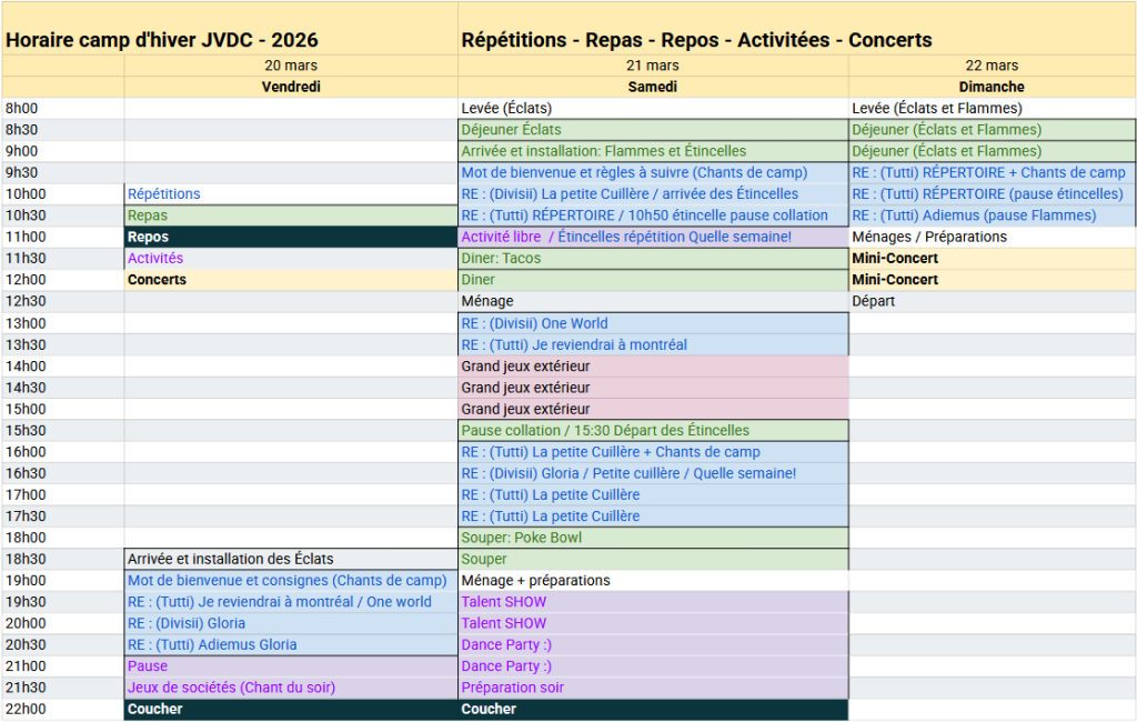 13h00 à 13h40 : tutti avec les Jeunes Voix du Cœur et le Choeur de la Montagne (avec leur cartable seulement. On doit garder les manteaux, boites à lunch, etc dans la classe.)